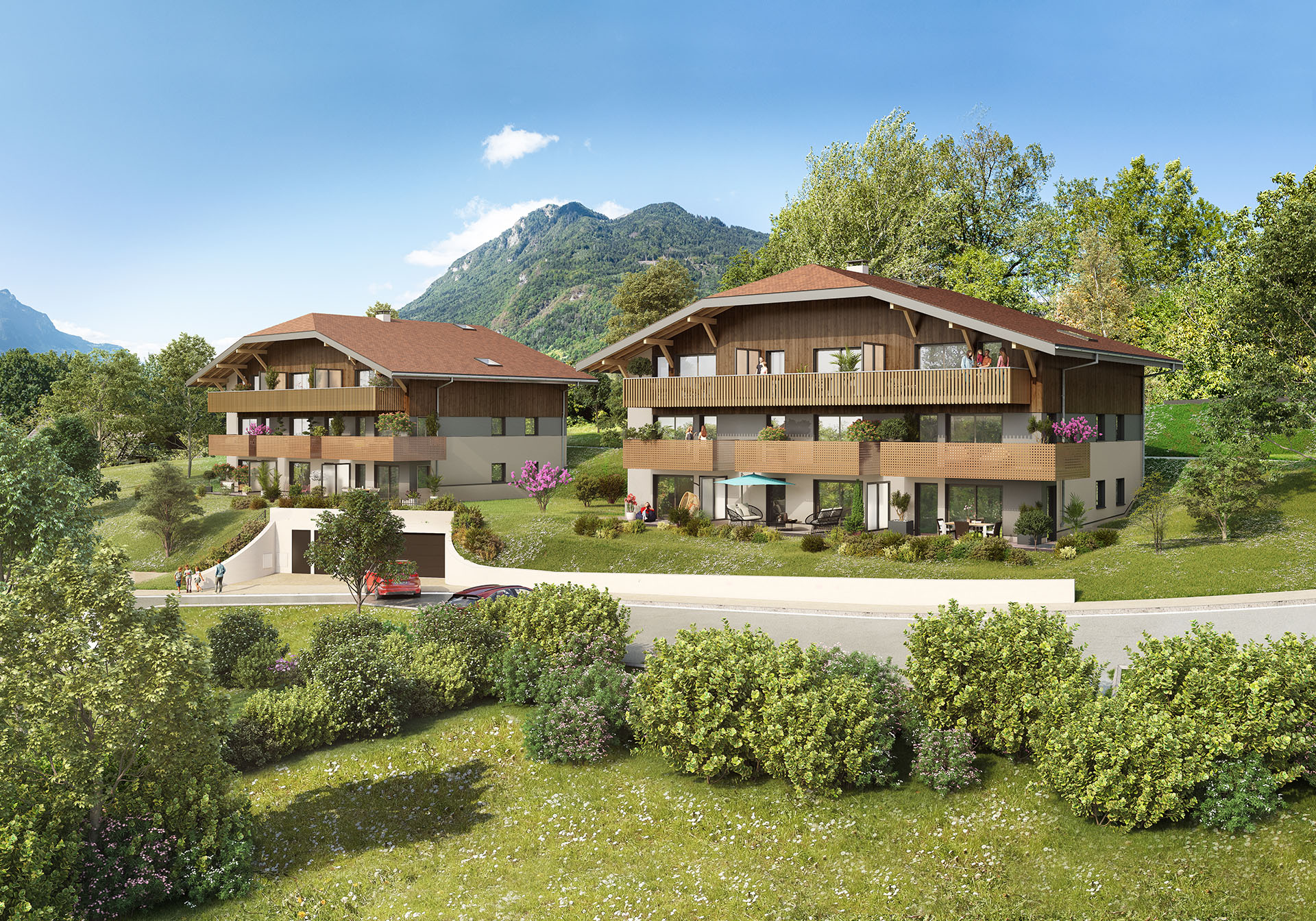 Le programme est composé de bâtiments de petite taille, nichés à flanc de coteau au cœur de la nature. L’architecture s’inspire de la tradition locale et s’intègre parfaitement dans un environnement à la fois rural et résidentiel. Les lignes sobres des bâtiments rappellent celles des fermes et des chalets avec leurs toitures à deux et trois pans. Les matériaux choisis par l’architecte font la part belle à la nature permettant au programme de se fondre dans le tissu résidentiel local : bois des bardages et balcons, choix de teintes douces et naturelles pour les façades telles que le grège ou le gris beige.